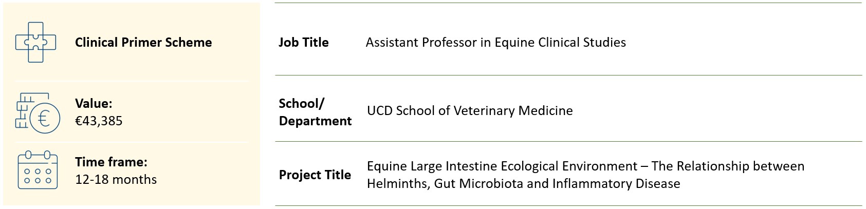 • UCD2 Transatlantic One Health Alliance, 2020: ¤60,000 – Predicting the Phenotype of Helminth Susceptibility in Horses and Translational Applications. (co-investigator)