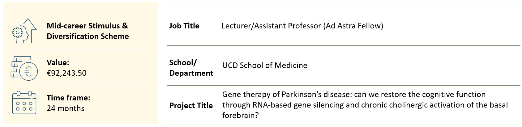 With the support of ISSF I was able to initiate my translational preclinical research. The funding allowed me to test cutting-edge technology for gene therapy with transgenic rodent model of Parkinson’s Disease. Without the support of ISSF I would have been unable to obtain vital preliminary data. These data gave me the required expertise to apply for competitive research grants and to establish further my lab in the field of preclinical gene therapy. Furthermore, the ISSF research project enabled me to develop collaborations with clinicians in Dublin hospitals, where I plan to translate my work in the next few years.