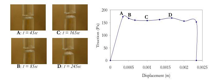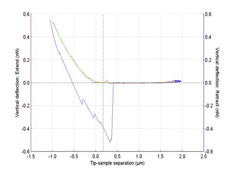 In bulk scale, stress relaxation response of wastewater biofilms was determined subjected to compression testing at constant deformation rates in linear range. Fig. 1 shows relaxation modulus response. Adhesion strength and strain energy were also measured by stretching the biofilm samples between 2 glass bars. Fig. 2 shows traction-displacement curve for a typical biofilm sample during stretch testing In nano-scale, Atomic Force Microscopy (AFM) in contact mode force measurement was used to measure the Young’s modulus as well as evaluating the de-adhesion properties of biofilm samples grown on the cover-slips. Fig. 3 shows approach (red) and retraction (blue) phases of a typical force curve. Young’s modulus was calculated using Hertzian model (green).
