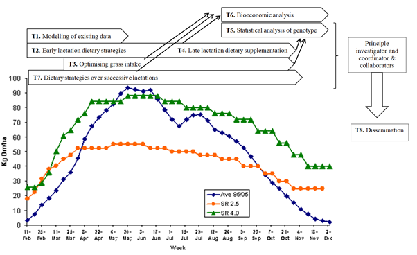 High yielding dairy cows have a higher requirement for energy intake and in a grass based system optimising grass intake whilst following best practise guidelines for pasture management can be a challenge. In addition problems with milk quality (processability) are more pronounced in a seasonal system and issues of milk quality in late lactation is an area of concern. Also, there is much debate about the correct supplementation strategies and also the response of various cow genotypes in late lactation.