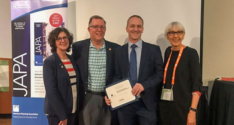 Eoin O’Neill, Associate Professor of Environmental Policy receiving the Award at the 2019 JAPA Annual Award Ceremony in Greenville, South Carolina. L to R: Deborah Lawlor (President, American Institute of Certified Planners); Kurt Christiansen, (President, American Planning Association); Eoin O’Neill (Head of School, APEP); Ann Forsyth (JAPA Editor)