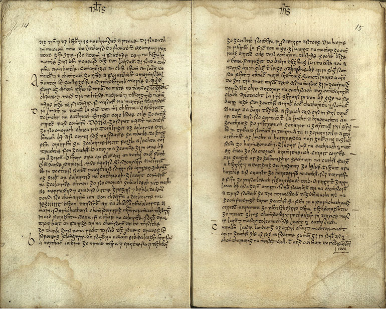 Tadhg Ó Cianáin, historian to Hugh O’Neill, maintained a unique diary of the journey of the Earls of Tyrone and Tyrconnell as they and their retinue travelled from Donegal to Rome from September 1607 to November 1608. Probably written in Rome, this manuscript is an invaluable account of the earls’ voyage and a remarkable insight into the political, religious and cultural milieu of early modern Ireland and Europe. It was subsequently removed to Louvain by John McColgan. It was returned to St Isidore’s in 1793 and from there to Dublin in 1872.
