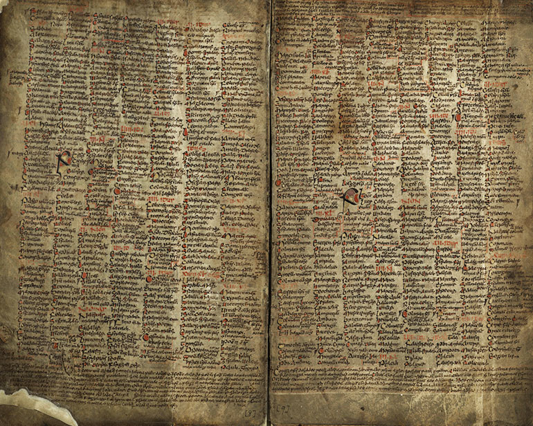 The ten surviving leave containing the Martyrology of Tallaght were once part of the Book of Leinster. The prose text, which details the feast-days of saints arranged according to the day of the year on which they died, was ncompiled at Tallaght, County Dublin. This is the earliest surviving manuscript of the Martyrology which was first compiled in the early ninth century. There are 3-8 columns per page and c.60 lines per column.