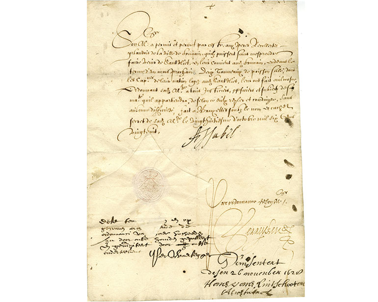 Letter of permission in French, issued on 28 October 1628 and signed by the Archduchess Isabella, allowing the captains of Irish fishing boats harboured in Sant Vliet to send two tonnes of salted fish to St Anthony’s College as alms for the month of November 1628.