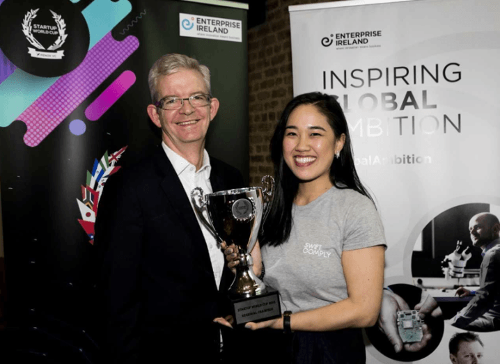 Joe Healy, divisional manager of High Potential Start-Ups at Enterprise Ireland, with Ireland regional winner Lindsey Nguyen, co-founder and head of product at SwiftComply, at the Startup World Cup Ireland qualifier. Image: Enterprise Ireland