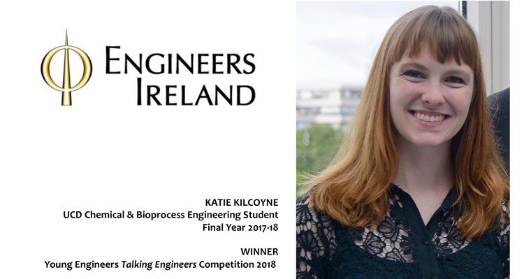 In winning this year's Talking Engineers competition, open to final year Engineering students from 3rd-level institutions around the country, Katie followed in the footsteps of the 2017 winner, Khadija Mu'azzam (BE Chemical & Bioprocess Engineering, 2017).