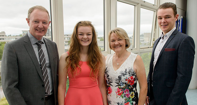 Catherine Galvin, Stage 3 student 2017-18, shown here with her family, winner of the McAdam Travel Bursary, presented by Assoc. Prof. Patricia Kieran, on behalf of sponsor, Martin McAdam (UCD BE ChemE 1982)