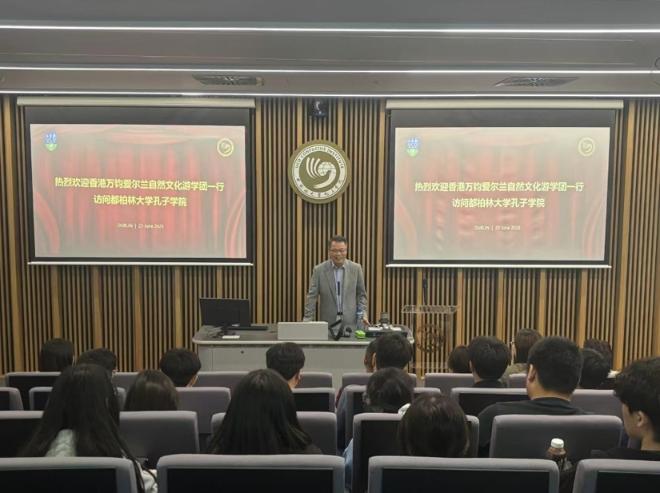6月23日上午,香港万钧爱尔兰自然文化游学团30余名师生到访都柏林大学爱尔兰中国研究院,开展学术交流活动。研究院王黎明教授对游学团的到访表示热烈欢迎,并做了题为《解密爱尔兰经济:概况、特点及展望》的讲座。王院长深入浅出的解析了爱尔兰凯尔特小虎经济飞跃的奥秘,强调通过优惠的税制吸引外资的驱动作用,结合公司案例阐释其从传统产业向高科技领域的转型路径。