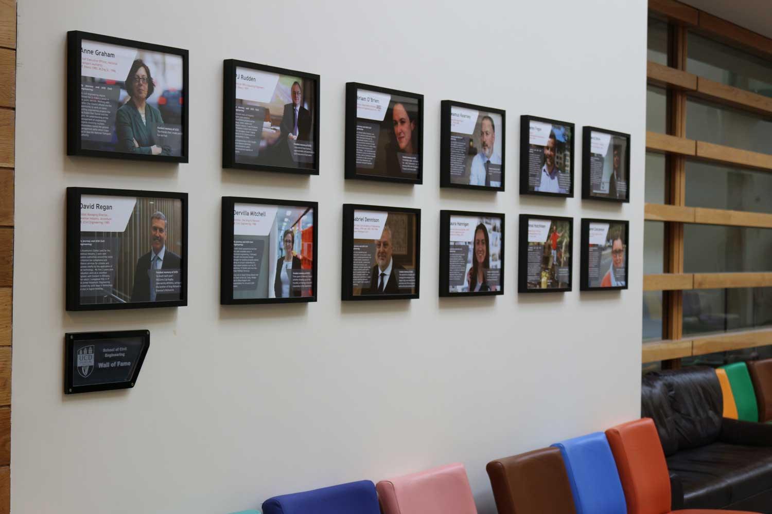 We have recently unveiled the School of Civil Engineering Wall of Fame. The Wall of Fame promotes graduates from our civil engineering degree who have excelled in their careers over the past thirty years. The diversity, leadership and success of these graduates at various career stages will hopefully inspire the next generation of undergraduates. Many thanks to our Wall of Famers; David Boles, Gabriel Dennison, Karen Concannon, Donal Hutchinson, James Fegan, P J Rudden, Laura Hannigan, Miriam O'Brien, Dervilla Mitchell CBE FREng FIEI FICE, David Regan & Seamus Kearney.