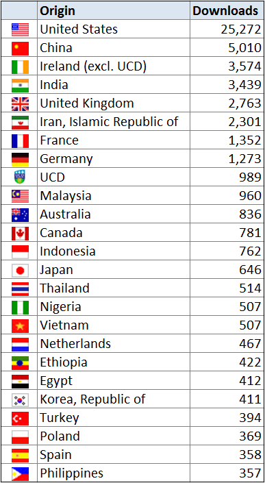 The School of Civil, Structural and Environmental Engineering is this year celebrating 100,000 downloads of their publications from Research Repository UCD. The collection has been going from strength to strength, with the number of downloads more than doubling each year since the School started uploading papers in 2010. The figure shows top downloads per country in the first 10 months of 2013.