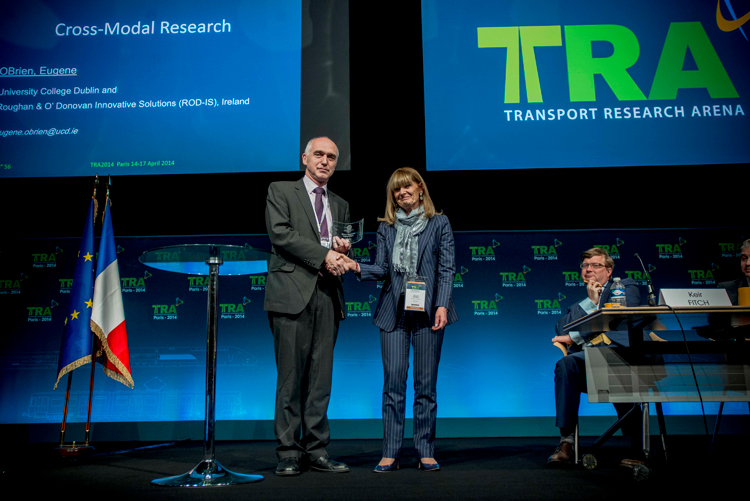 Manuela Soares, Director for Transport, DG Research and Innovation at the European Commission presents Professor OBrien with his award in Paris.