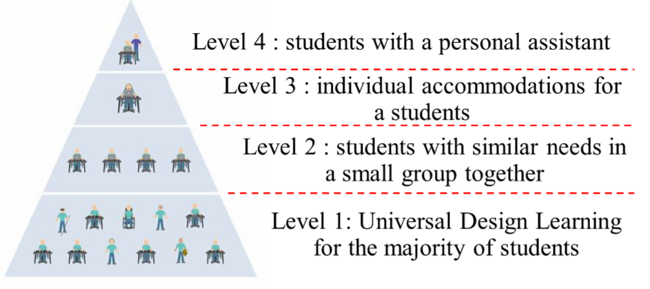 The goal of universal design is for every unit in UCD to be accessible to as many students as possible without needing additional support. Universal design refers to the provision of a product, service or environment which is accessible to the widest audience possible; i.e. not a one-size-fits-all solution – offer flexibility and alternative solutions where necessary. The following figure shows the pyramid of universal design: