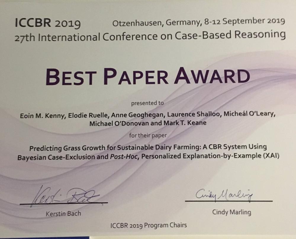Kenny, E.M., Ruelle, E., Geoghegan, A., Shalloo, L., O’Leary, M., O’Donovan, M. and Keane, M.T., 2019, September. Predicting Grass Growth for Sustainable Dairy Farming: A CBR System UsingBayesian Case-Exclusion and Post-Hoc, Personalized Explanation-by-Example (XAI). In International Conference on Case-Based Reasoning (pp. 172-187). Springer, Cham. This publication has emanated from research conducted with the financial support of (i) Science Foundation Ireland (SFI) to the Insight Centre for Data Analytics under Grant Number 12/RC/2289 and (ii) SFI and the Department of Agriculture, Food and Marine on behalf of the Government of Ireland to the VistaMilk SFI Research Centre under