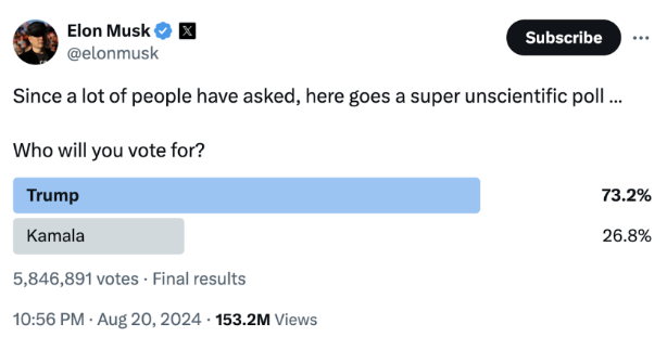 Informal political polls have grown in popularity on X, the platform formerly known as Twitter. For instance, one such (opens in a new window)poll, conducted recently by billionaire X owner Elon Musk, received over 5 million votes. It showed the Republican nominee, Donald Trump, leading over the Democratic nominee Kamala Harris by a landslide, 73.2% to 26.8%. Trump publicly featured the results of (opens in a new window)multiple (opens in a new window)such (opens in a new window)polls on his social media platform, Truth Social, presumably to create the impression of his overwhelming popularity.