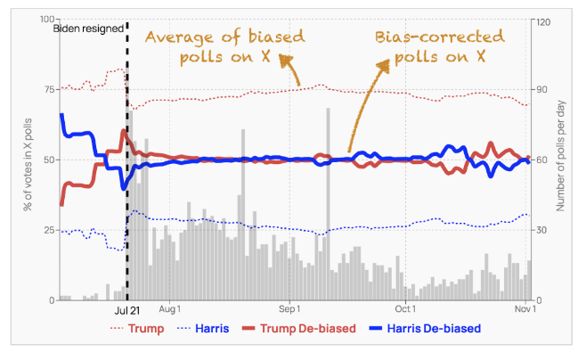 As we studied the biases in election polls published on X, it became clear that their bias was driven by the Republican lean and demographics of poll participants. However, these biases can be corrected to make estimates of public support for the candidates. The correction process, in essence, makes social poll outcomes representative of US voters using the so-called (opens in a new window)regression and post-stratification methodology…