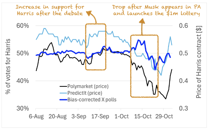 The time series of public support estimates based on X polls does not only synchronize with the 538 forecast. It also synchronizes with prediction markets, where players bet on the winner of the election, such as PredictIt and Polymarket (blue lines below).(opens in a new window)3These are not the only events in which there is synchrony between the four time series lines. In fact, right after the September 10 debate between Harris and Trump, the support for Harris increased according to all four time series (see the below, and above, figure).