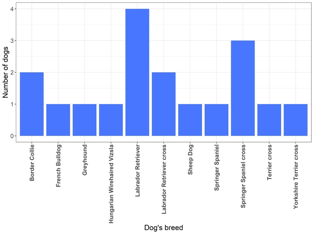 We collected dog breed data anonymously from our survey software (Qualtrics) to see what breeds are involved in the study. Most of the study participants own Labrador Retrievers or Labrador crosses, but we also have some border collies in the study, as well as Springer Spaniels and terriers.