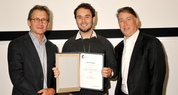 Pictured: Nobel Laurate Ben Ferringa (Groningen), UCD PhD student Eduardo Morais, and father of Green Chemistry Paul Anastas (Yale).
