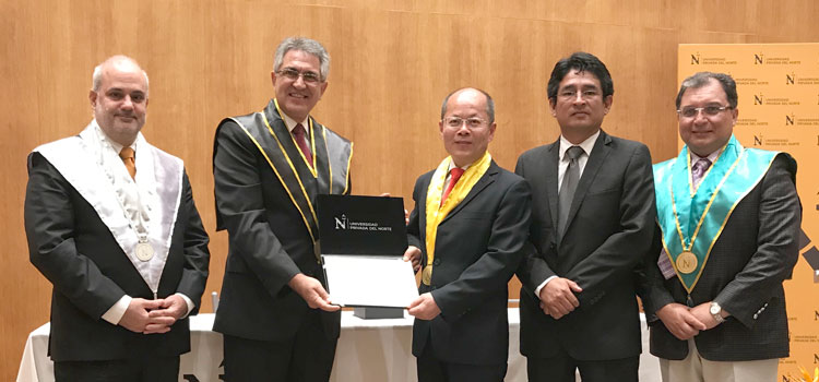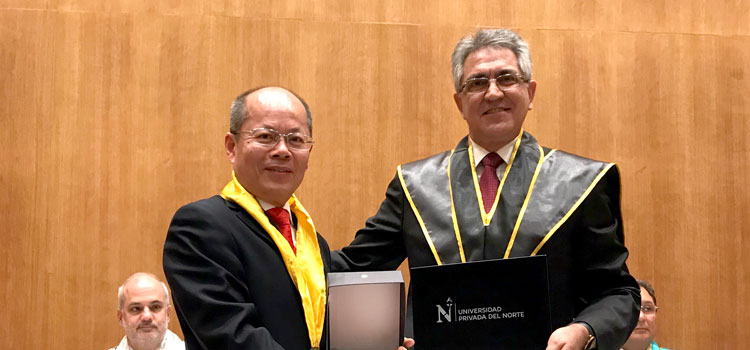 Professor Da-Wen Sun, from UCD School of Biosystems and Food Engineering, has been conferred with Honorary Doctorate Degree from Universidad Privada del Norte (UPN) in Peru in recognition of his exceptional contribution and leading role for advancing food and biosystems engineering research and education at the global level. A special conferring ceremony was held on 12 February 2018 in the Breña Campus of UPN in Lima. Dr Andrés Velarde, the Rector of UPN, presented Professor Sun with the certificate, medal and plaque of the honorary doctorate of UPN.
