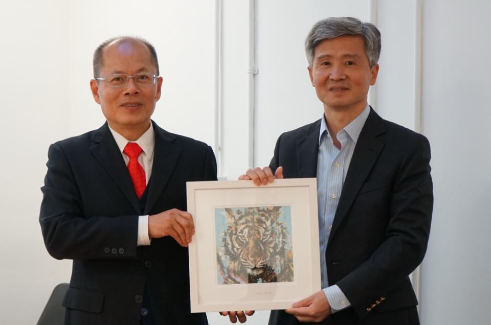 Ambassador He Xiangdong presents a souvenir to Professor Da-Wen Sun