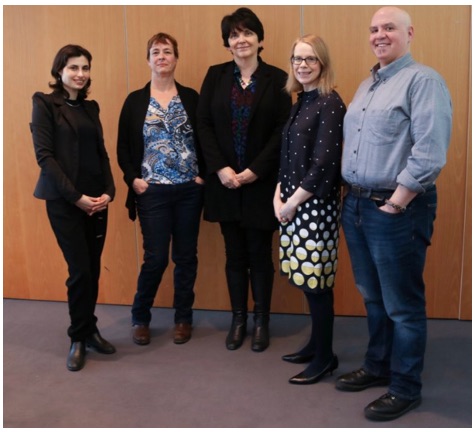 Chairs of the UCD School of Economics and the UCD School of Languages, Cultures and Linguistics EDI Committee receiving the Bronze Athena SWAN award in March 2020 (from right): Prof Ron Davis, Assoc. Prof Orla Doyle, Prof Orla Feely, Prof Bettina Migge, Dr. Pascale Baker.