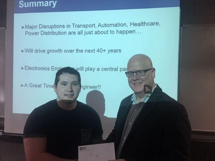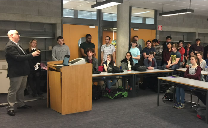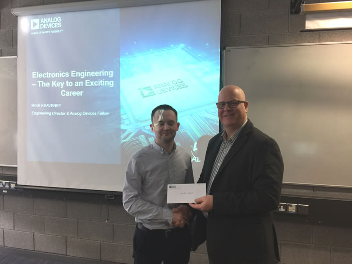 On March 9th Mike Keaveney of Analog Devices Ireland and an Engineering Director & Analog Devices Fellow, gave a talk entitled “Electronic Engineering – The Key to an Exciting Career” as arranged by UCD's Electronic and Electrical Engineering Society. Mike was accompanied by Rachel King of the HR department at ADI.