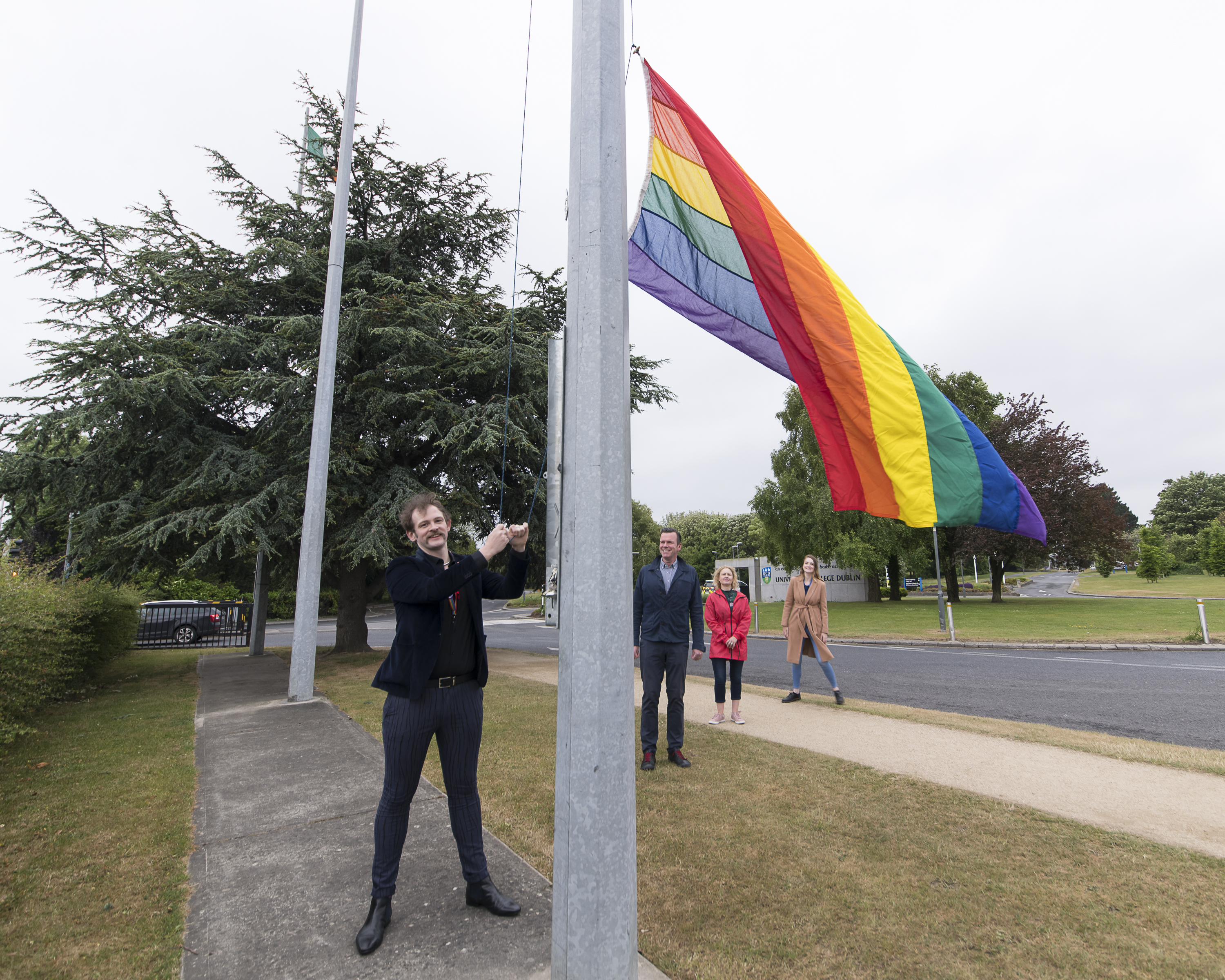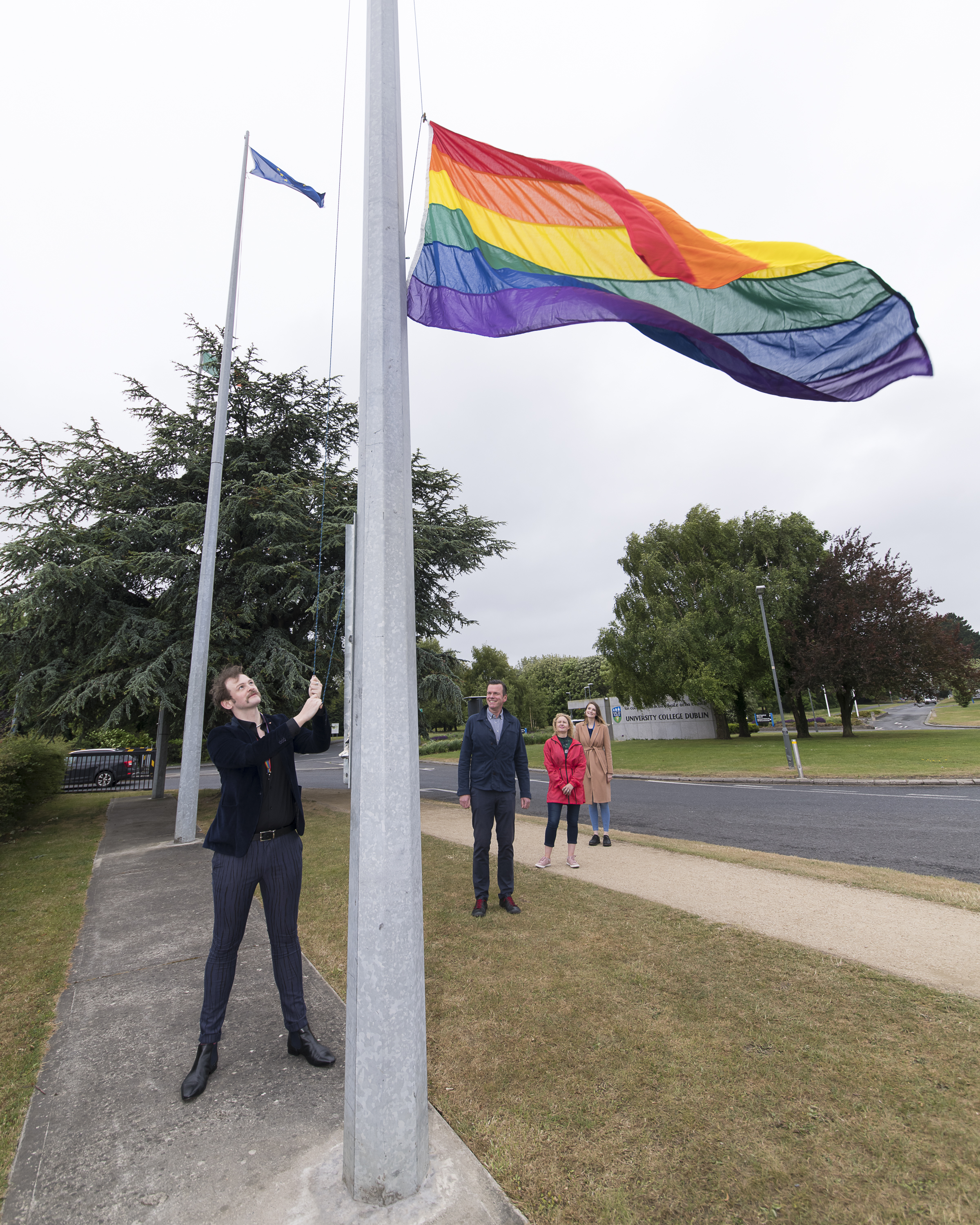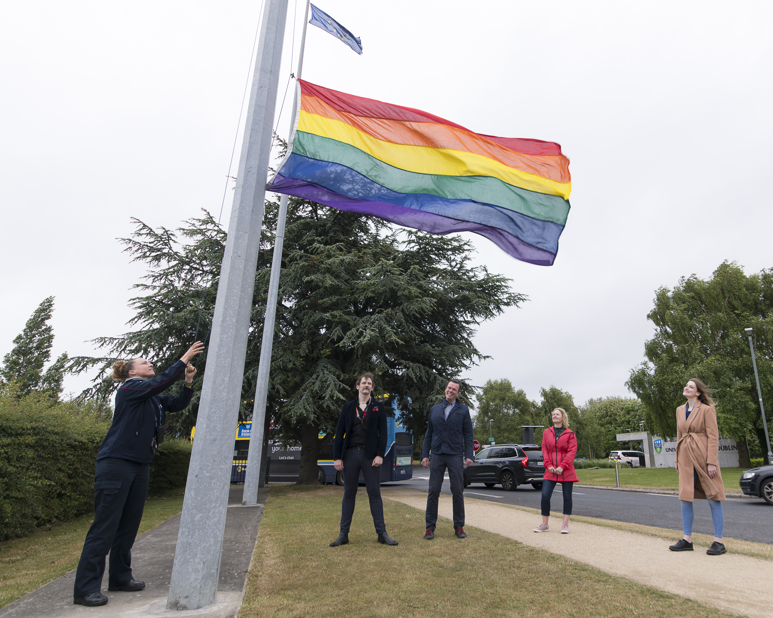 UCD invited Dublin Pride's joint Grand Marshall, John Gilmore, Assistant Professor, School of Nursing, Midwifery & Health Systems to join Paul D'Alton, Associate Professor of the School Psychology and Chair of the LGBTI Sub-Group, Marcellina Fogarty, Strategic EDI Manager and Eimear O' Reilly, EDI Project Officer to raise the Pride flag in UCD.