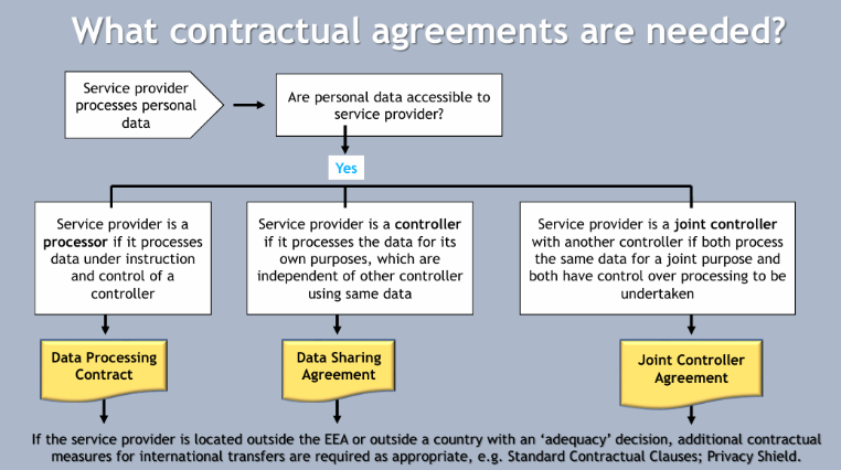 - UCD as controller shares personal data with a service provider or outsources activities to a third party, which acts as a processor. In such a scenario, a controller - processor contract/data processing agreement is mandatory. UCD needs to provide detailed instructions to the processor and the processor would only be allowed to further share the personal data if UCD gives detailed written permission to do so.