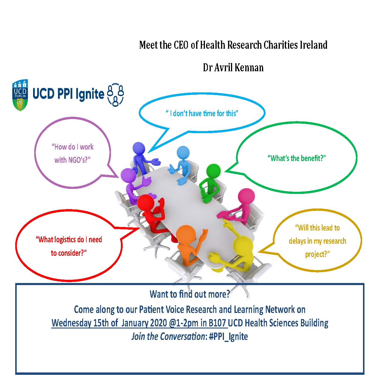 The next UCD PPI Ignite Patient Voice session takes place Wednesday 15th January with a presentation from Dr Avril Kennan, CEO of Health Research Charities Ireland. All welcome to attend.