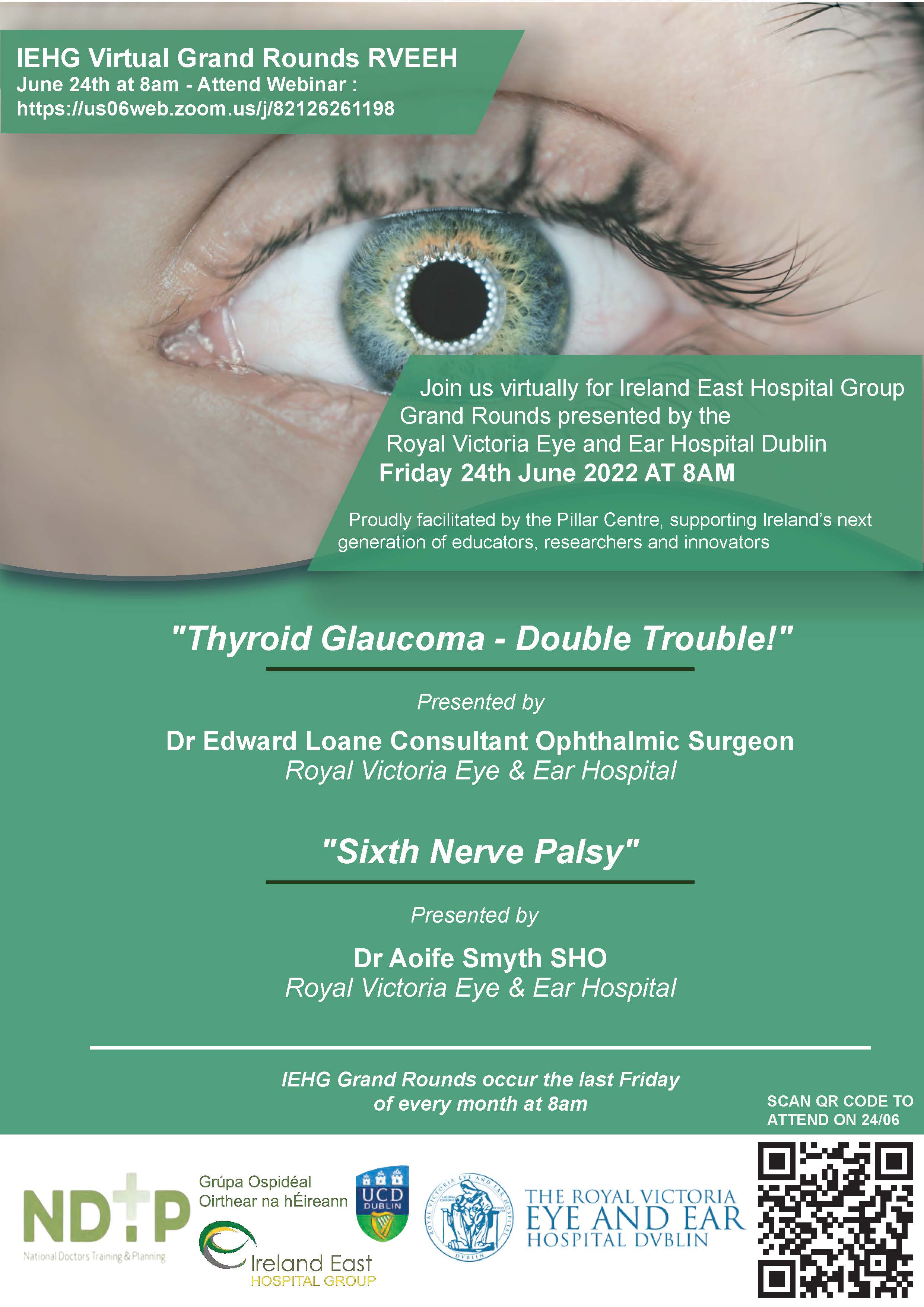 UCD Health Affairs and (opens in a new window)Ireland East Hospital Group (IEHG) are launching their 11th Virtual Grand Rounds from Royal Victoria Eye and Ear Hospital on Friday, 24th June 2022 at 8am.