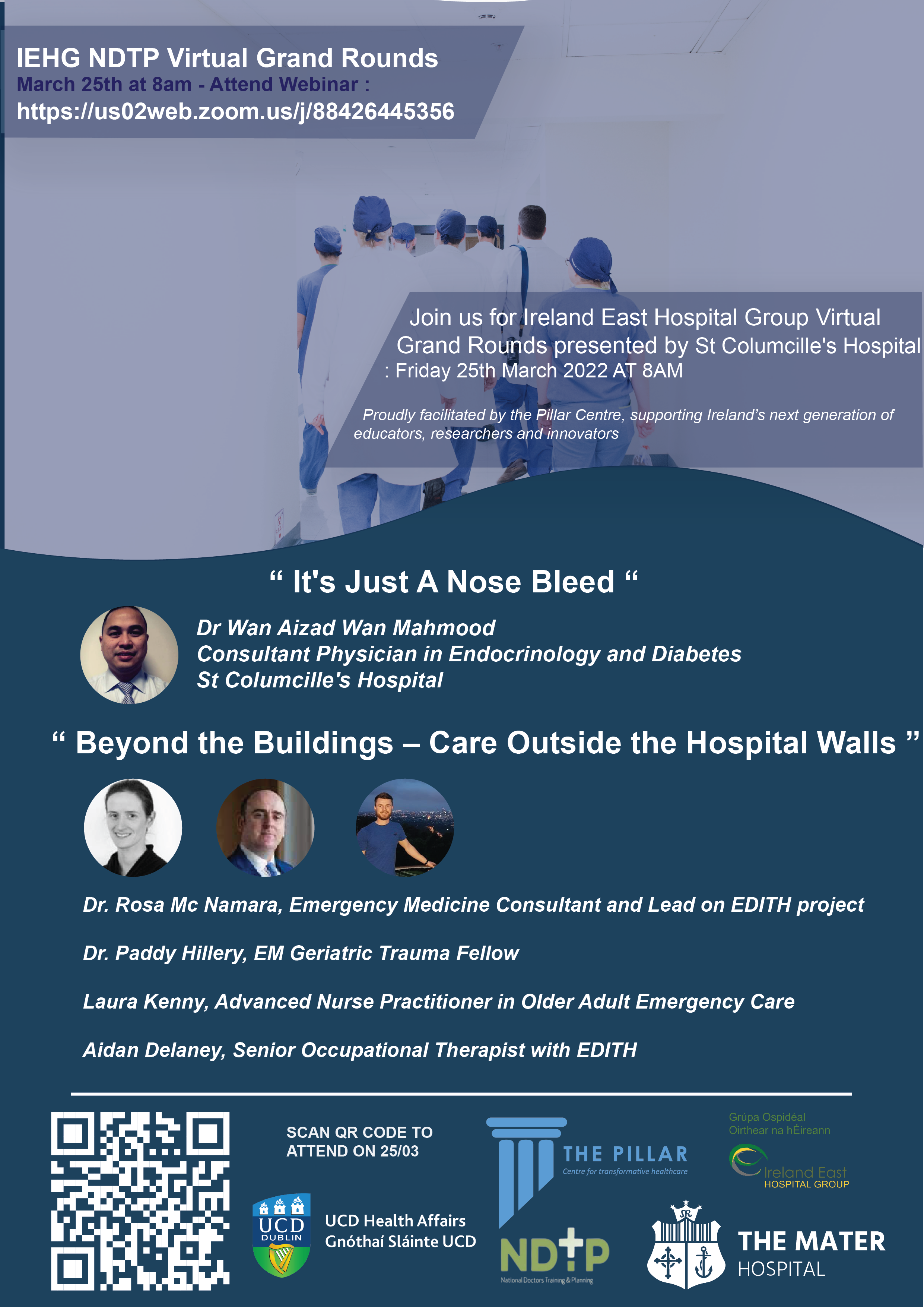 UCD Health Affairs and (opens in a new window)Ireland East Hospital Group (IEHG) NDTP are launching their eighth Virtual Grand Rounds from St. Columcille’s Hospital on Friday, 25th March 2022 at 8am.