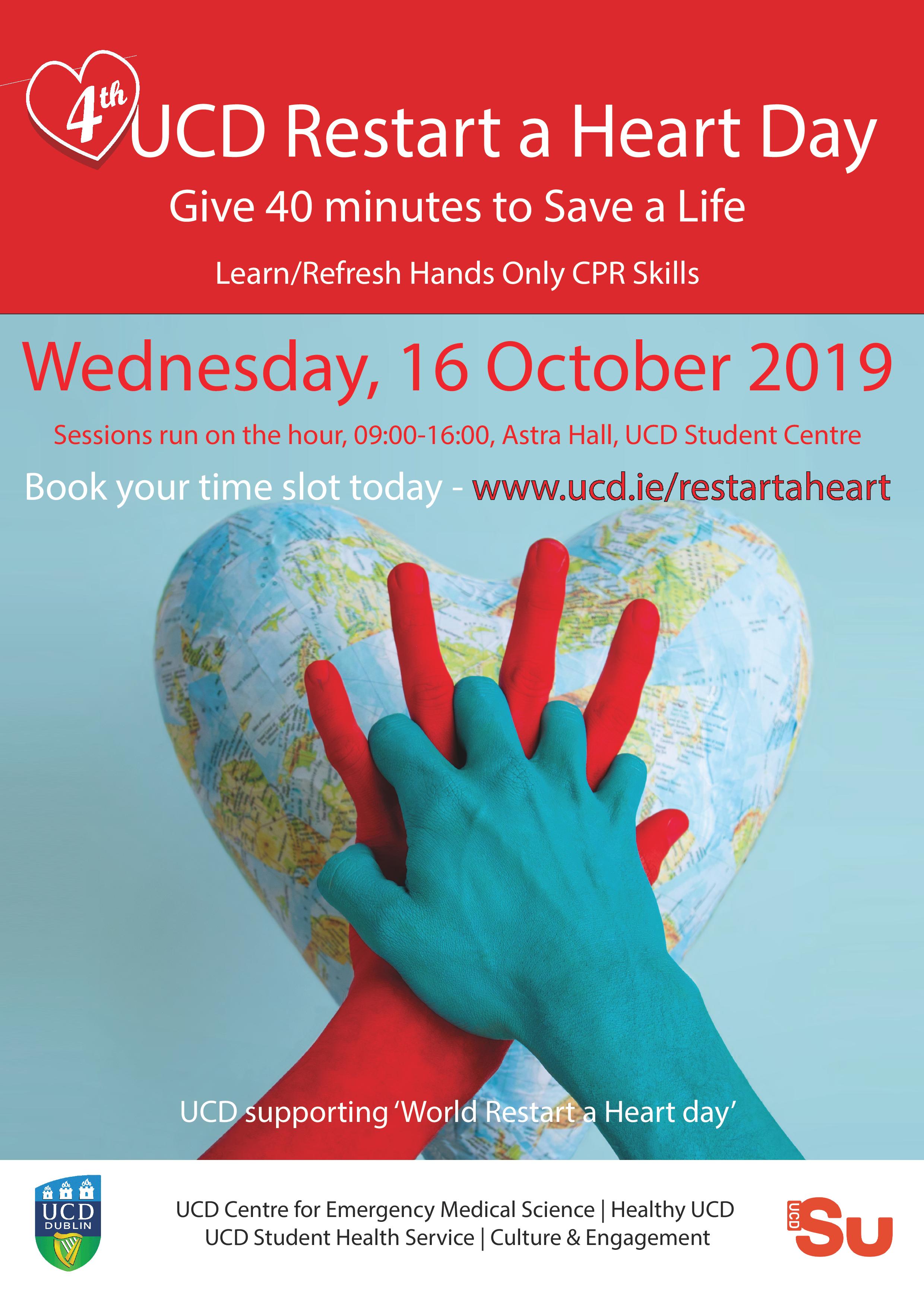 40 minute CPR sessions take place on the hour, every hour 9am to 4pm, in Astra Hall, UCD Student Centre. Book yours today at www.ucd.ie/restartaheart