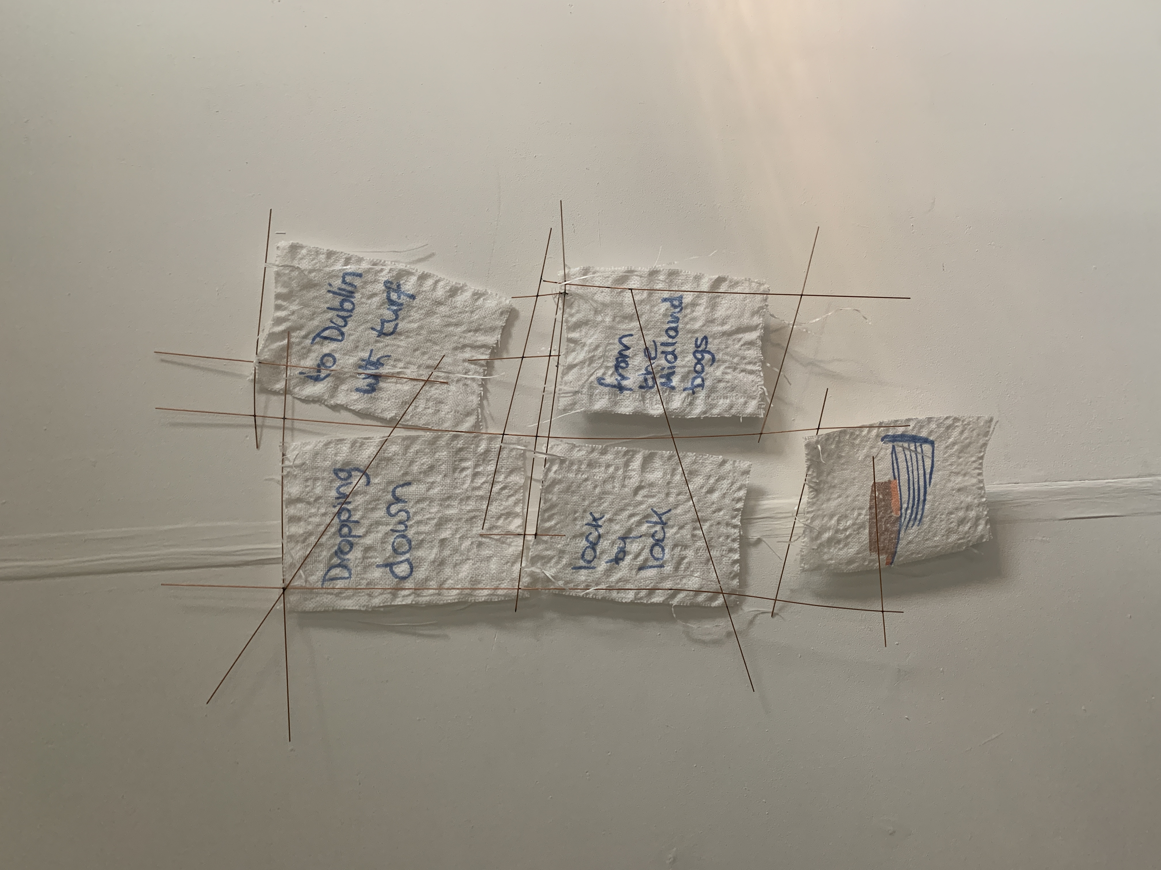 The industrial history of turf cutting is referenced in a quote from James Joyce’s Ulysses which captures how canal barges are dropping down the canal locks from the Irish midlands to deliver turf to Dublin. This short passage of text hangs on a rickety frame and is printed on the kind of bag fabric that can be found withering across the boglands today. It connotes a disappearing industry that continues to effect the landscape.