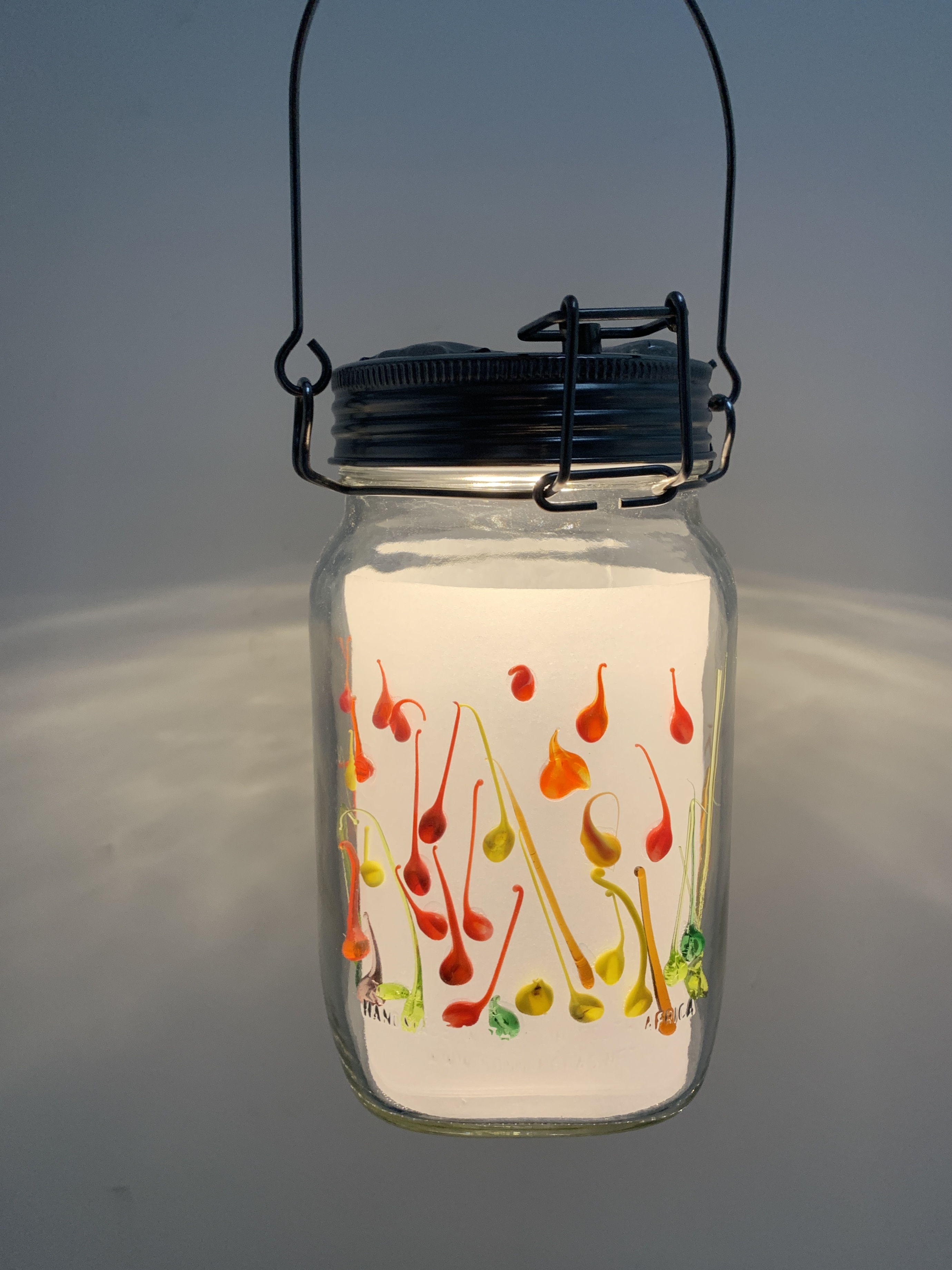 It is becoming widely recognised that we cannot renew the Irish boglands when we extract material from them. Consequently, we are turning to more sustainable power sources such as solar energy. A suspended lantern harnesses solar power that lights miniature glass pieces inspired by the flora of the bog lands. A flame can be a warning of hazards and a lantern may be lit in memory of loss or to guide to welcome travellers.