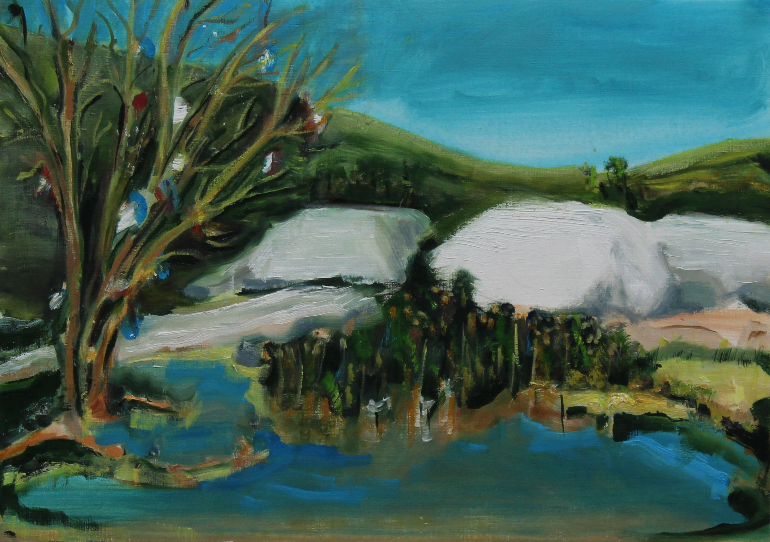 In April 2023, my first research trip with UCD Humanities Institute and the Study participants was to the oil-shale mining district of Ida-Virumaa in Estonia. This blanched countryside is smothered by mounds of ash. I was taken by the ‘ghost-thing’ inherent in the Ida-Virumaa landscape. There are bleached hills, blanched roads and empty abandoned towns, the legacy of oil-shale mining in the area. This territory is no longer suitable for agriculture. Layers of trees and soil metres deep were removed to make way for the mines. Any remaining trees cling to an uncertain earth. It has an eerie artificial beauty that I tried to express in my Ida-Virumaa paintings.