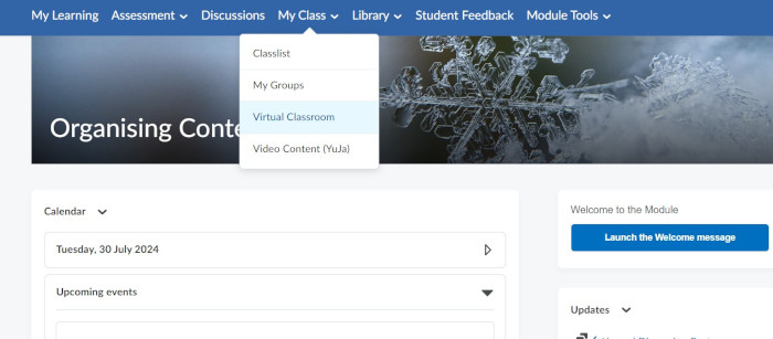 Zoom can be accessed directly from within Brightspace modules via the My Class menu in the navigation bar. It is a real time web conferencing tool which is used to support teaching delivery.