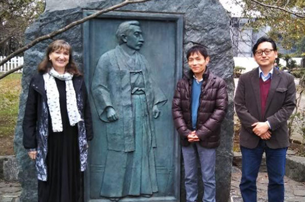 Prof. Mary Gallagher (School of Languages, Cultures and Linguistics) is one of a small number of Irish scholars currently working on Lafcadio Hearn, undoubtedly one of the world’s most global writers. Although of Anglo-Irish/Greek origin, Hearn is claimed not just as an American writer, but also as one of Japan’s most beloved authors. Having left Europe forever at 19, he began his writing career in Cincinnati (Ohio), before spending nearly twelve years studying black and mixed life-stories in the Creole heartlands of New Orleans and the French Caribbean. Then, in 1890, aged 40, he was off to Japan, where he adopted Japanese nationality and a Japanese name, Yakumo Koizumi,  and where he had four children, taught English literature at many colleges and universities including Waseda and Tokyo, and pursued his huge literary oeuvre. From 1890 this centres on the stories of Japan but is haunted by the full global reach of his diverse cultural origins, affiliations, and gravitations. At 54, he passed away and is buried in Japan. In February 2019, Mary Gallagher visited Matsue and Kumamoto, where Hearn lived, wrote, and taught. She is pictured above in front of the Hearn memorial sculpture at the University of Kumamoto, where she gave a lecture on Hearn’s storytelling (at the University’s (opens in a new window)Centre for Soseki-Hearn Studies).