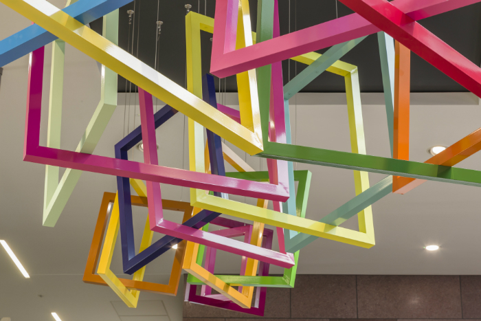 This vibrant, kinetic artwork was created as a focal point and complementary centrepiece for the School’s spacious atrium. The artist, Martina Galvin, describes the piece as ‘an explosion of the joyous celebration of colour’ and her inspiration was derived from the dynamic nature of the students, staff and visitors engaged in the discussion of the law within the School. The artwork is formed from an intriguing interconnection of colourful cubes of varying sizes which can be viewed from different viewpoints including the entrance to the School, the ground floor atrium and first floor gallery. The size, intricate shape and vibrant colour palette of Croí all contribute to the powerful impact that this piece will have on the community of the Sutherland School of Law into the future.