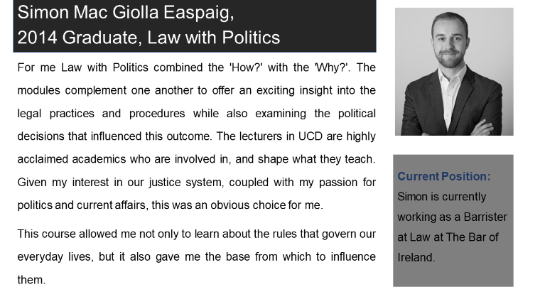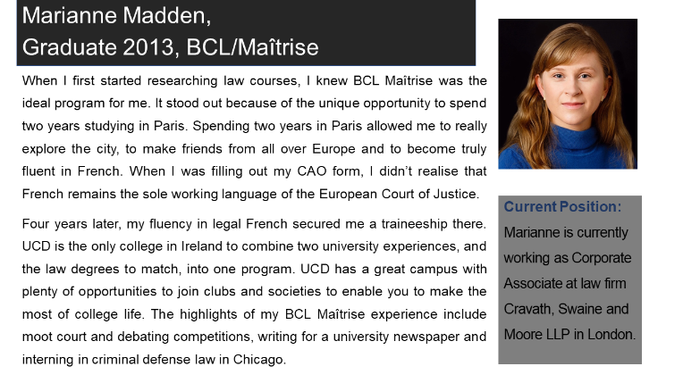 This is a unique degree offered by UCD Sutherland School of Law where students spend their first year studying Law with French Law and then apply to switch to the ‘Dual Degree’ in second year. Two years are spent in France studying the civil law system and, as the testimonials below demonstrate, students frequently pursue international legal careers on graduation from this degree.