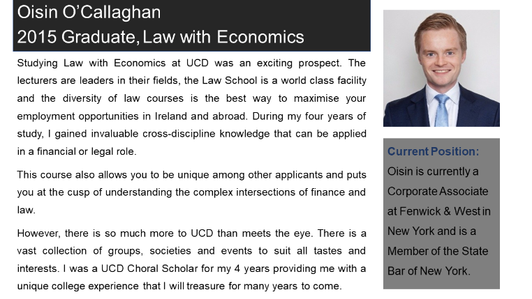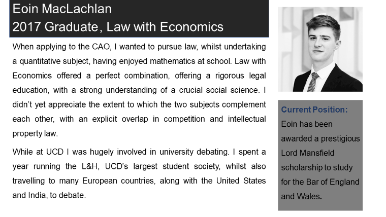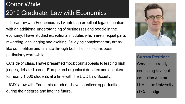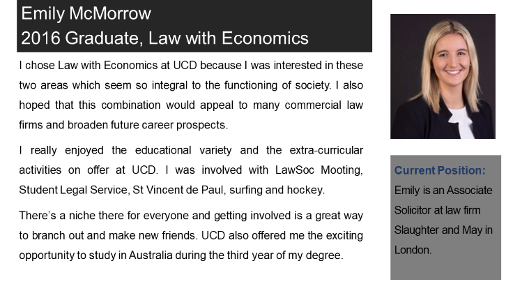 Law with Economics is a highly valued degree in the workplace in both the legal and commercial spheres as the employment positions of our recent graduates below will attest. For an insight into the student experience of a current Law with Economics student, view this testimonial video from (opens in a new window)Caoimhe Gethings.