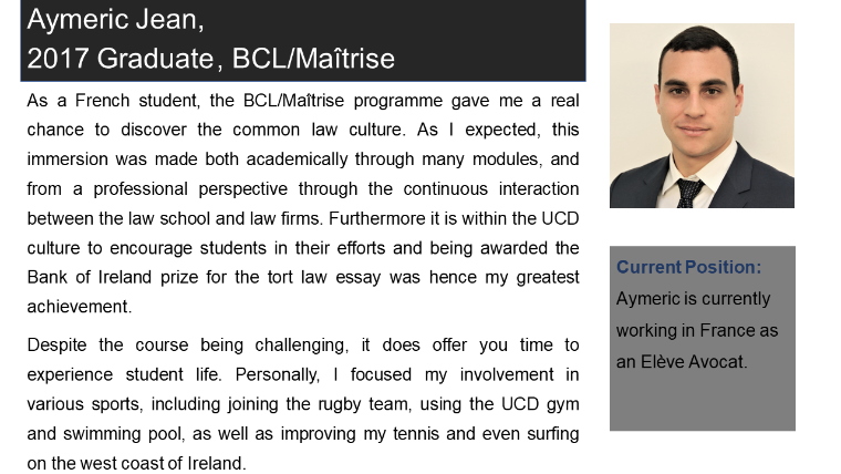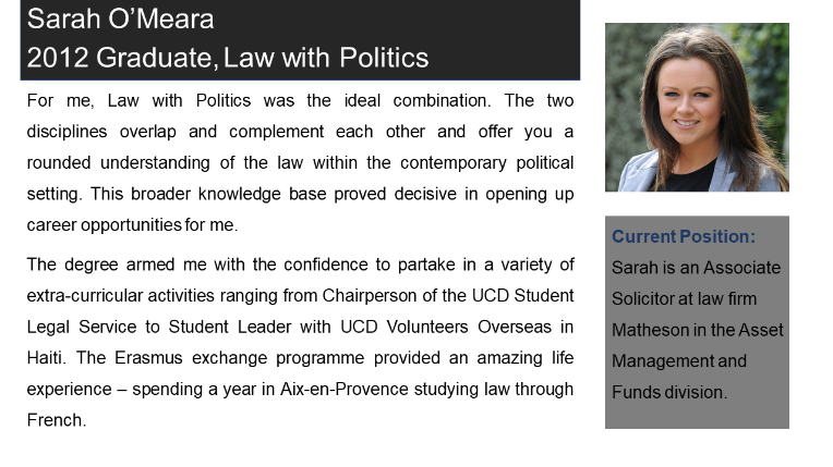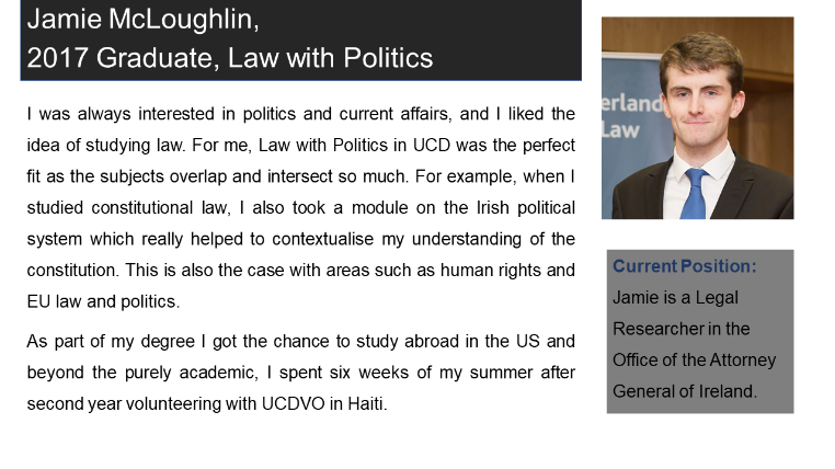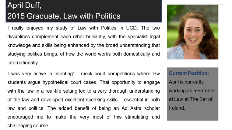 Members of the legal profession are often individuals who have a strong interest in politics and the UCD School of Law counts amongst its graduates a former Taoiseach and Tánaiste as well as many TDs, broadcasters and political journalists. Students of this degree will enjoy the opportunity to spend time with those in UCD’s highly-regarded School of Politics, as well as with their classmates in law.