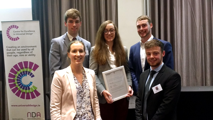 A team of students from 3rd year Mechanical Engineering won the Commercialisation Award at the Universal Design Grand Challenge tonight. The award is organised by the National Disability Authority but is sponsored by Enterprise Ireland. The team, Fiachra Doherty, Conor Molloy, Clodagh Dunne and Jamie Carroll, won for their product PnP Analytics which aims to prevent pressure sores by detecting the absence of pressure shifting movements in those who are confined to beds for long periods.