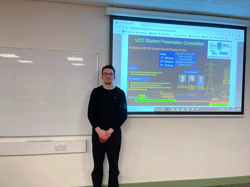 "Paul Mucchielli, a Doctoral Researcher in MME recently won the UCD IEEE Power and Energy Society (PES) Award for his presentation on "Reducing the operational requirements of wind turbines with real-time downtime detection". Paul, supervised by Vikram Pakrashi, is a member of UCD Centre for Mechanics and funded by Sustainable Energy Authority of Ireland in the WindPearl project (RDD00263).