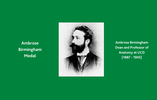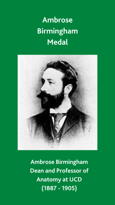Ambrose Birmingham (1864-1905) was appointed Dean and Professor of Anatomy at the Catholic University of Ireland Medical School (UCD) at the age of 23 (1887-1905). Ambrose showed great aptitude and ability at such a young age, in keeping with this tradition the Ambrose Birmingham Medal was founded by the School and has been awarded to medical students since 1916.