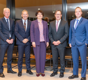 Speakers L to R: Professor Michael Keane - Dean, UCD School of Medicine and Acting CEO at St Vincent’s University Hospital; Dr David Fennelly - Clinical Director of St. Vincent’s UCD Cancer Centre; UCD President, Professor Orla Feely; Professor Risteard O’Laoide - Director, National Cancer Control Programme; Liam Gallagher - Scientific Director, St Vincent’s UCD Cancer Centre