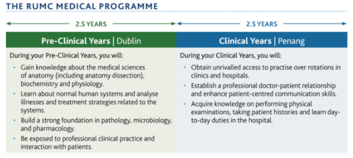 A small number of students may be required to do a foundation (pre-medical) year which can be undertaken in Penang or Dublin and which is designed to provide appropriate knowledge for students to enter a five-year medical course.