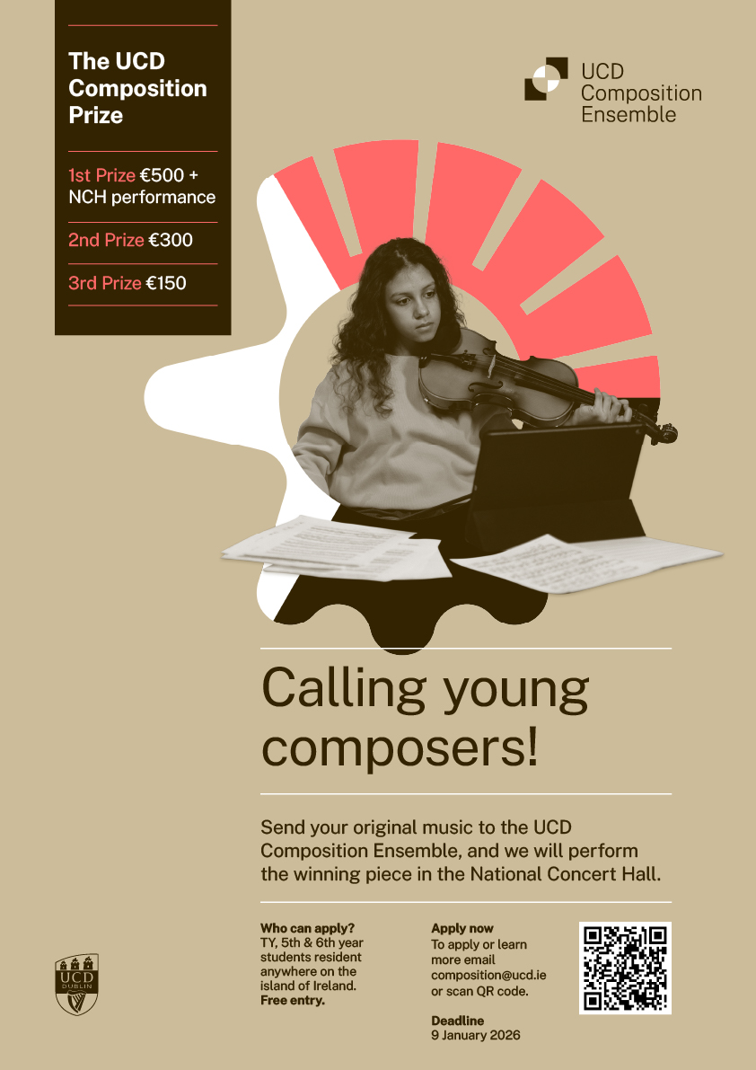 The winning piece will be performed by the UCD Composition Ensemble in Ireland's National Concert Hall on Friday 24th April 2026.