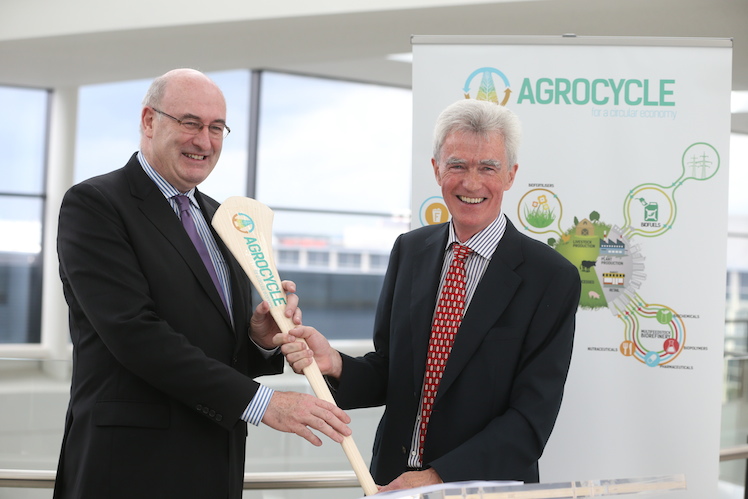 Pictured top: Professor Shane Ward, UCD School of Biosystems and Food Engineering, presents Phil Hogan, European Commissioner for Agriculture and Rural Development, with the AgroCycle hurley during the launch, at the UCD O'Brien Centre for Science, of the €8 million AgroCycle ‘circular economy’ project