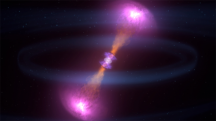 Additional still from animation. As neutron stars collide, some of the debris blasts away in particle jets moving at nearly the speed of light, producing a brief burst of gamma rays. Credit: NASA's Goddard Space Flight Center/CI Lab
