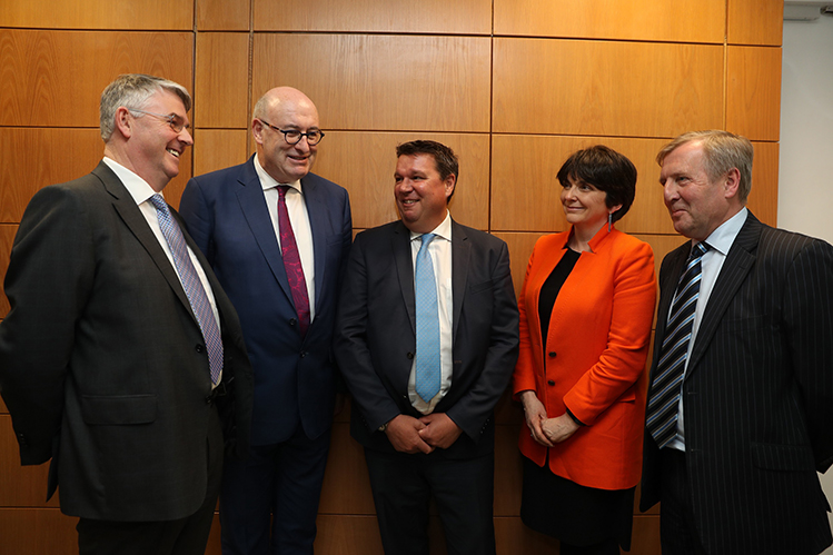 Pictured (l-r) Jim Bergin, CEO, Glanbia Ireland; Phil Hogan, Commissioner for Agriculture and Rural Development; Philippe Mengal, Executive Director, BBI JU; Prof. Orla Feely, UCD Vice-President for Research, Innovation and Impact and Michael Creed TD, Minister for Agriculture, Food and the Marine (Jason Clarke Photography)